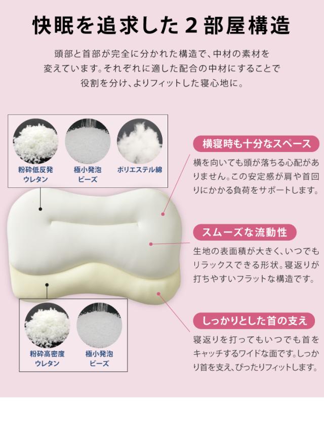 下から上にしっかりと支えてくれる「粉砕低反発ウレタン」、水の流れのようにスムーズに動き左右の動きをサポートする「極細ポリスチレンビーズ」、雲の上にいるようなふわふわした感触を楽しめる「マイクロファイバー綿」。3つの素材をバランス良く配合した枕、それが「空間fitの夢まくら」。