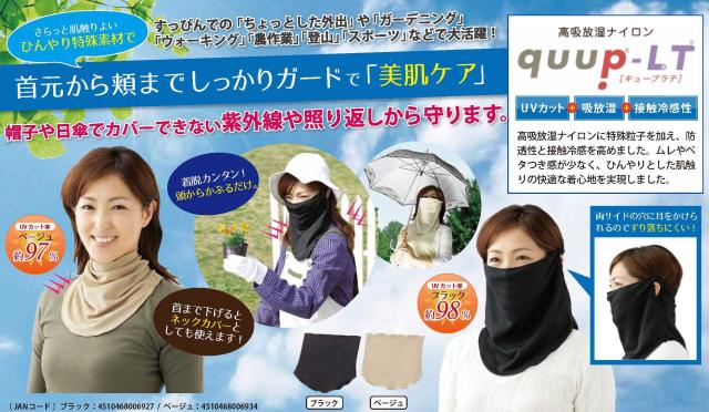 さらっと肌触りのよいひんやり特殊素材で、首元から頬までしっかりガードで「美肌ケア」着脱カンタン!頭からかぶるだけ。