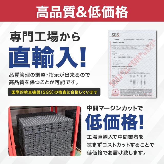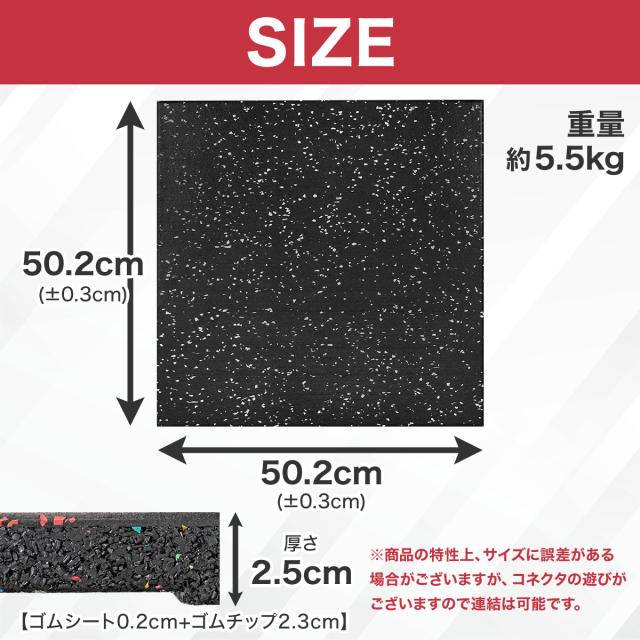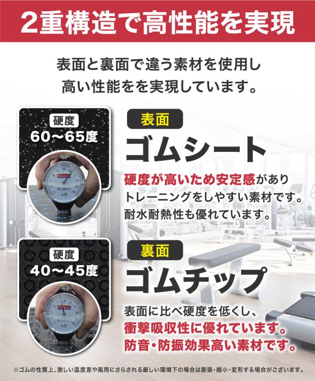 【ゴムシートとゴムチップの高性能な2重構造】表面はトレーニングのしやすい安定感を追求した硬度の高いゴムシートを、裏面は衝撃吸収性に優れ、防音・防振効果を高めるために表面よりも硬度を低くしたゴムチップを採用。表面と裏面で違う素材を使用することで、動きやすさを確保しながらも重量器具から床へのダメージを軽減する高性能を実現しました。