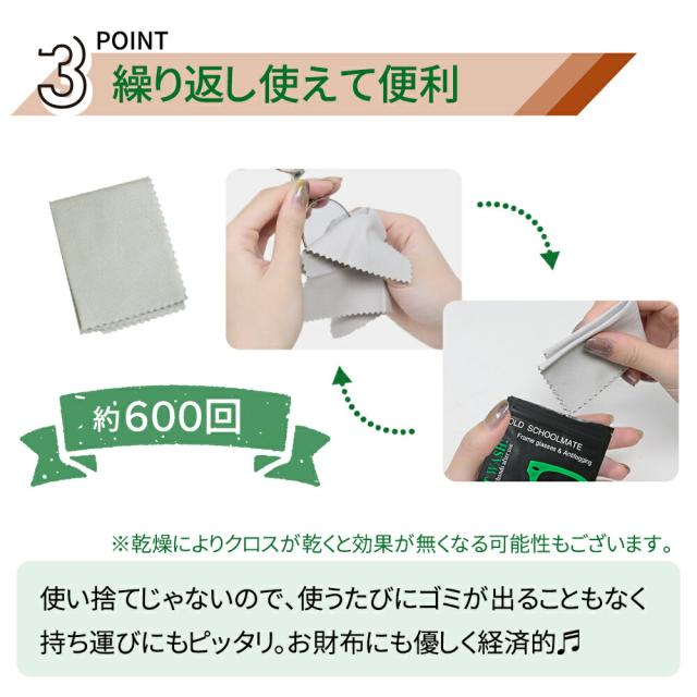 - 曇り止めでもちょっと良く分かりませんが、クロスが液体でぬるぬるしていてとても使い勝手が悪いように思います。メガネを磨いた後にクロスで拭いて乾かすように書かてありますが白ぽっくなり透明度がなくなります。