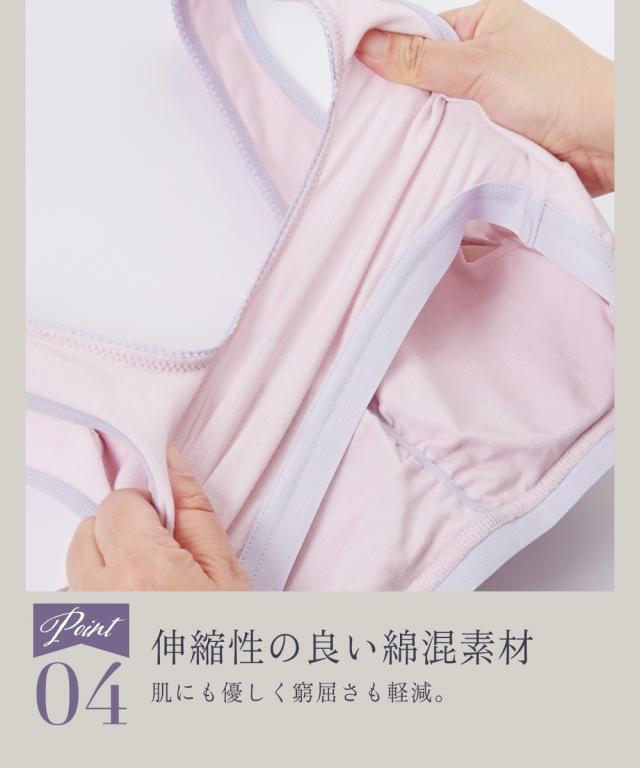 着用しやすくしっかり安定!寝ている時もサポートしてくれるナイトブラジャー!可愛くシンプルなデザインだから、パジャマやルームウェアだけじゃなく、いろんなシーンで着用していただけます。脇流れをしっかり防止する内寄せパネルと、サイド安定設計だから、ノンワイヤーなのに安心の着用感!嬉しい綿95%素材で肌への負担も軽減♪ソフトなゴムと幅広ストラップ設計で、寝ている間もゴロつきません。小さく畳めるので、持ち運べてかさばりません。Mサイズから10Lサイズまでの豊富なサイズバリエーション!