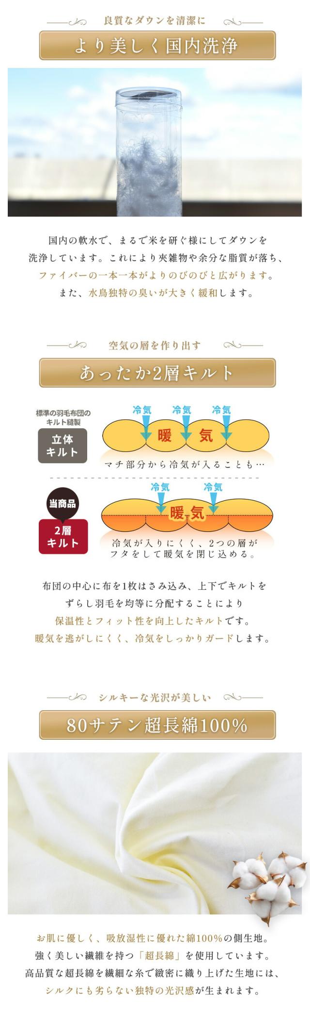 | ・のびのびと飼育された熟成ダウン ポーランドのグースはストレスのない自由な環境で育ちます。しっかりと完熟し、保温性と透湿性が抜群に高く、純白度や耐久性も合わせて世界一と評価されています。 ・食肉〜ダウン清潔な工場で一元管理「アニメックス」は1951年に、食肉関連製品の国営輸出公団「ANIMEX」として創立。生産のプロセスである飼育〜加工にいたる全過程を一貫して把握しています。 ・本物のポーランド産証明書付すべて本物のポーランド産羽毛を使用したものであることが証明されています。証明書のQRコードをスキャンすることで商品に使われているダウンの情報を確認することができます。 ・非常に希少なポーランドマザーグースダウン95%その中でもアニメックスは高品質なグースダウンを提供しており、羽毛布団に使われるダウンとしては非常に希少なダウンとなります。 ・2層キルトふっくらパンパンに張った羽毛布団では、体と布団の間にどうしても隙間ができてしまいます。その隙間を冷たい空気が通る為、ダウンの品質は良いのに「寒い羽毛」となってしまうのです。二層キルトは肌沿いを意識し、上層部と下層部で羽毛の「マス目」を変化させました。ゆったりと肌に沿う、賢いキルトです。 ・超長綿 80サテン超長綿は綿花からとれる非常に長い繊維で、地球上の綿花のたった5%しか生産できない希少価値の高い綿素材です。肌触りが良く、吸湿性に優れた綿は羽毛布団と相性の良い素材。超長綿は通常の綿より繊維が長く、ソフトでしなやか、さらに吸湿性や通気性に優れています。80番手の糸を使用したとてもやわらかな生地です。 | |