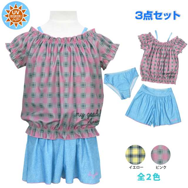 水着 3点セット 子供 スイムウェア チェック柄ピンク