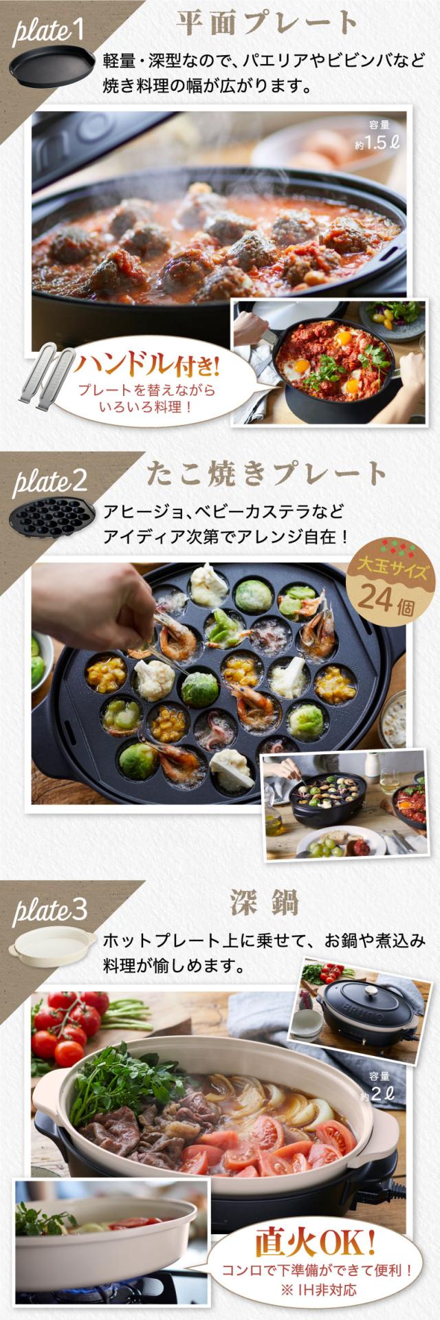 ●平面、たこ焼き、深鍋と充実のプレートがセットに。