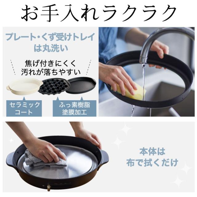 | 材質 | 本体:スチール/フェノール樹脂 平面プレート・たこ焼きプレート:アルミニウム合金(内面ふっ素樹脂塗膜加工) 深鍋:アルミニウム合金(内面セラミックコート、外面ふっ素樹脂塗膜加工) くず受けトレイ:スチール プレート取り替え用ハンドル:ステンレス鋼 |