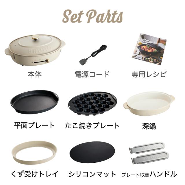 | 付属品 | 平面プレート、たこ焼きプレート、深鍋、プレート取り替え用ハンドル×2、シリコンマット、マグネット式脱着電源コード |