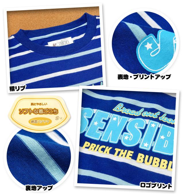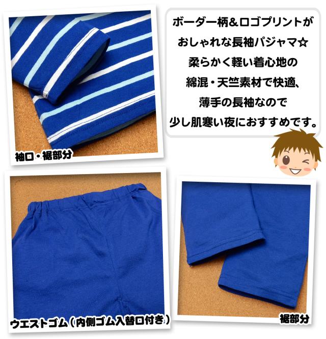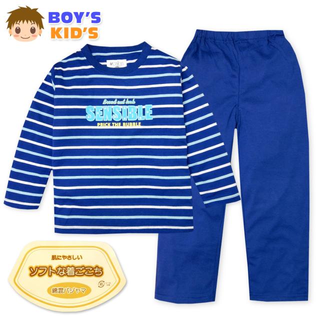【送料無料】男児 キッズ 天竺 長袖 パジャマ 上下組 薄手 ボーダー柄 ロゴプリント 子供服 男の子 120cm a-2149c-nv【メール便対応】