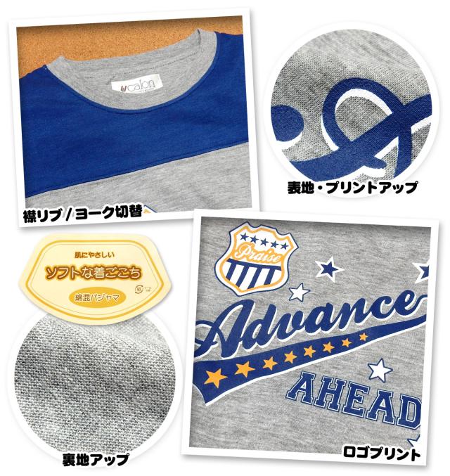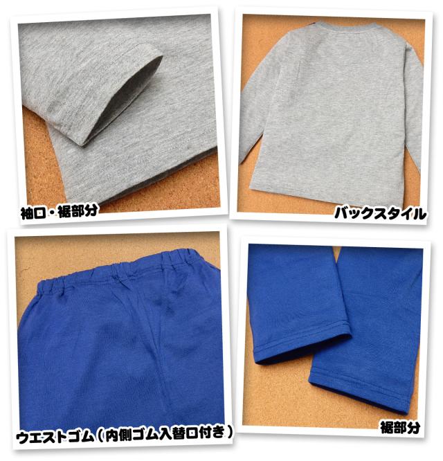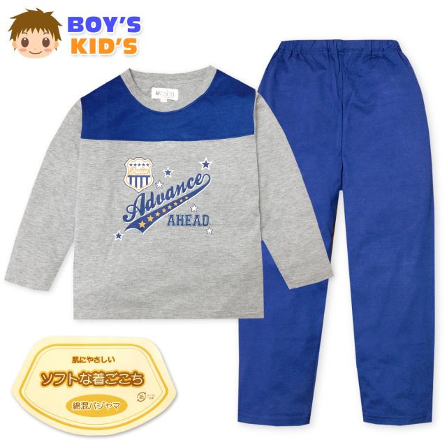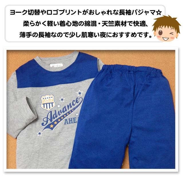【送料無料】男児 キッズ 天竺 長袖 パジャマ 上下組 薄手 ヨーク切替 ロゴプリント 子供服 男の子 120cm a-2148a-gy【メール便対応】