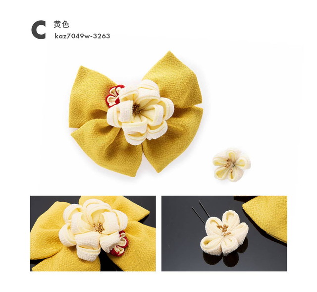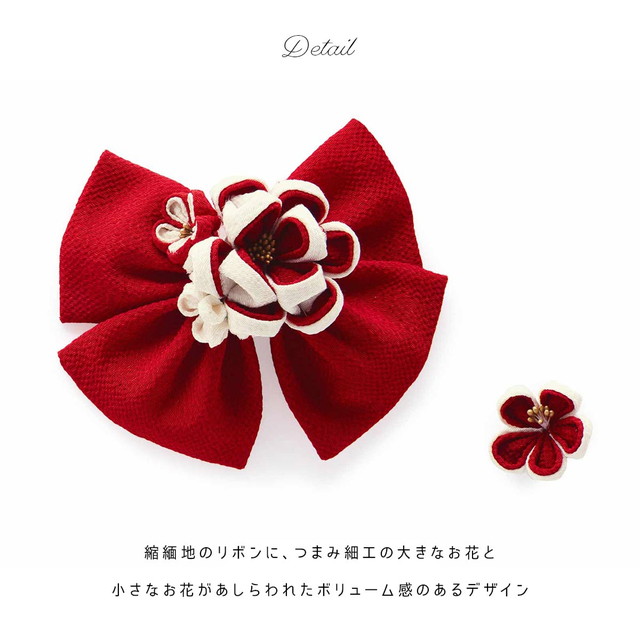縮緬地のふわりとしたリボンに、つまみ細工の大きなお花と小さなお花があしらわれたボリューム感のあるデザインです。