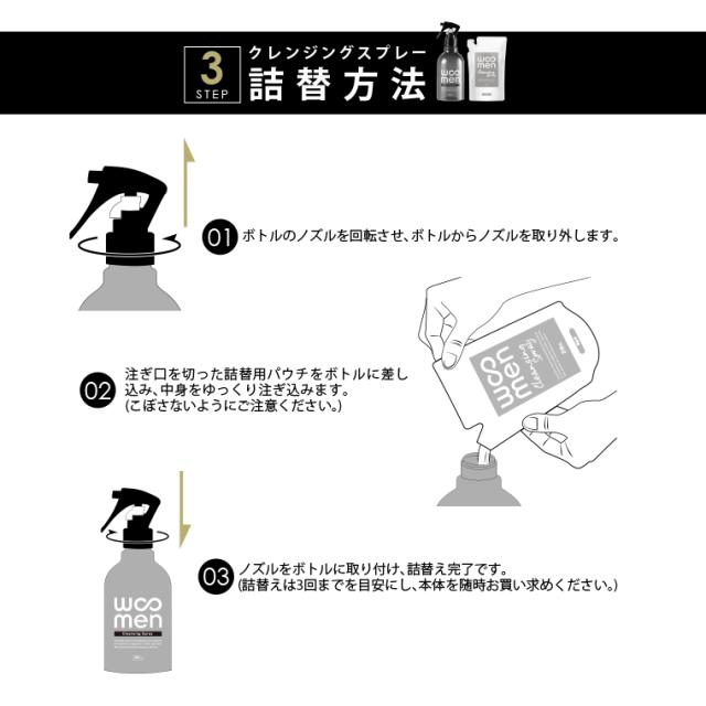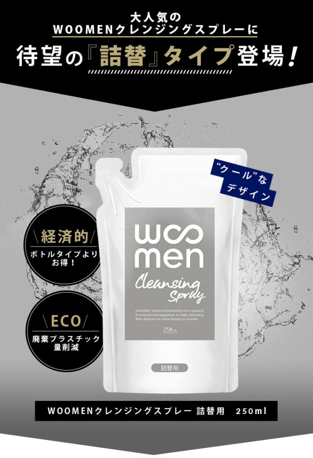 【詰替/3個セット】WOOMENクレンジングスプレー 詰め替え250ml×3個 つめかえ レフィル パウチ スプレー洗顔 メンズ用 男性用 クレンジングウォーター リキッド 人気 ウーメン woomen 送料無料 agesugi_sbe