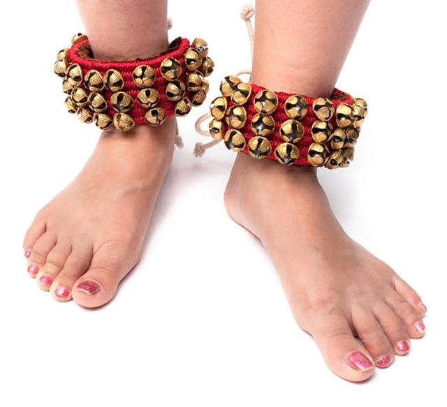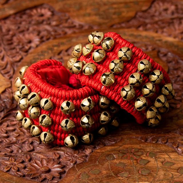 カタックダンスの時に足につけて音響効果を出す為の足鈴です。一個一個のグングルの大きさは通常タイプ。そこまで大きな音が出るわけではありませんので、ステージの上だけでなく、野外フェスに行く時に付けて行くこともできますね。このグングルは3ラインのグングルが付いているタイプです。インドの現地向け商品なので、パッドや紐などに多少のくすみや色ムラがある場合もございますが、それもインドならではです。