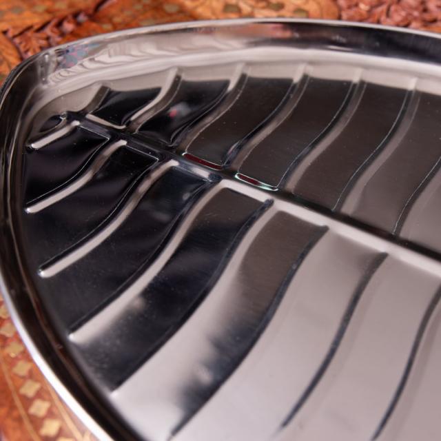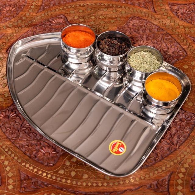 こちらの食器は、そんなバナナの葉っぱをモチーフにしたステンレス食器です。南インドで用いられているバナナの葉と、北インドで一般的に使われているステンレス食器。それぞれの魅力を融合したような製品です。本物のバナナの葉はなかなか手に入りませんが、こちらの食器なら南インド料理を出すときも雰囲気を損なわず、お手軽に料理を盛り付けることができます。