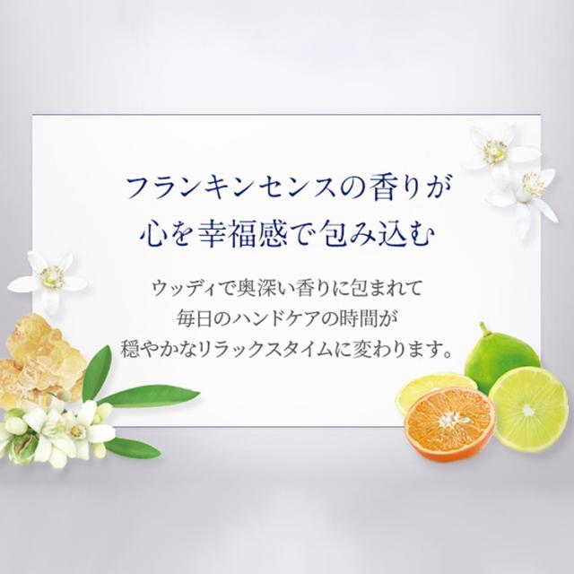 ●フランキンセンス インテンスハンドセラムは、リボース*1、ナルキッソスエキス*2、とフェアワイルド認証のローズヒップオイル*3を配合し、軽い使用感でキメの整った滑らかな肌へ導きます。