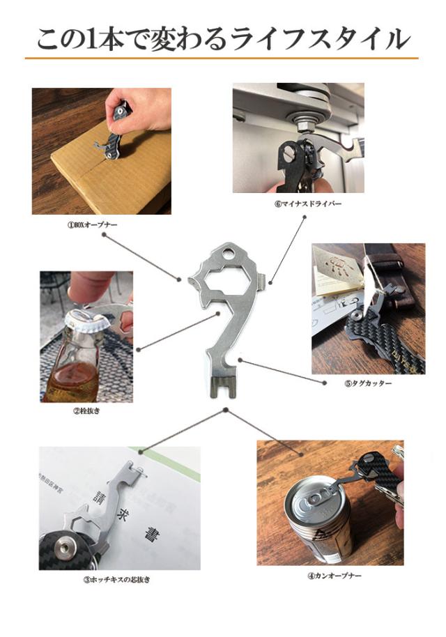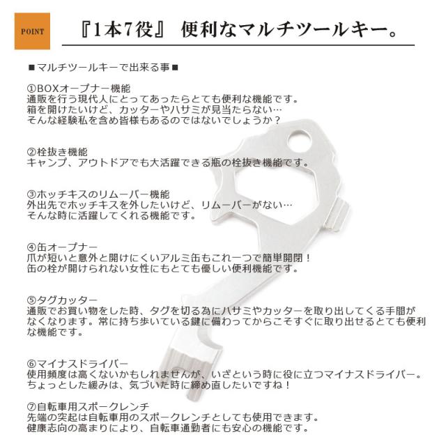 キーオーガナイザーと組み合わせて使えるマルチツールキーとなります。丈夫なステンレス製で7つの用途で使えるので鍵と一緒に備えておけばちょっとしたときに便利です。