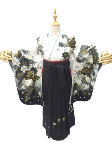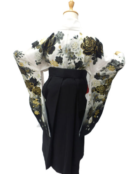 着物色:白地 バラ柄 袴色:黒地に桜の刺繍柄