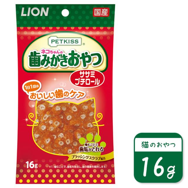 ライオン PETKISS ネコちゃんの 歯みがき おやつ ササミプチロール 16g ■ キャットフード 国産 ドライ おやつ ペットキス デンタル 口臭 歯垢 ケア