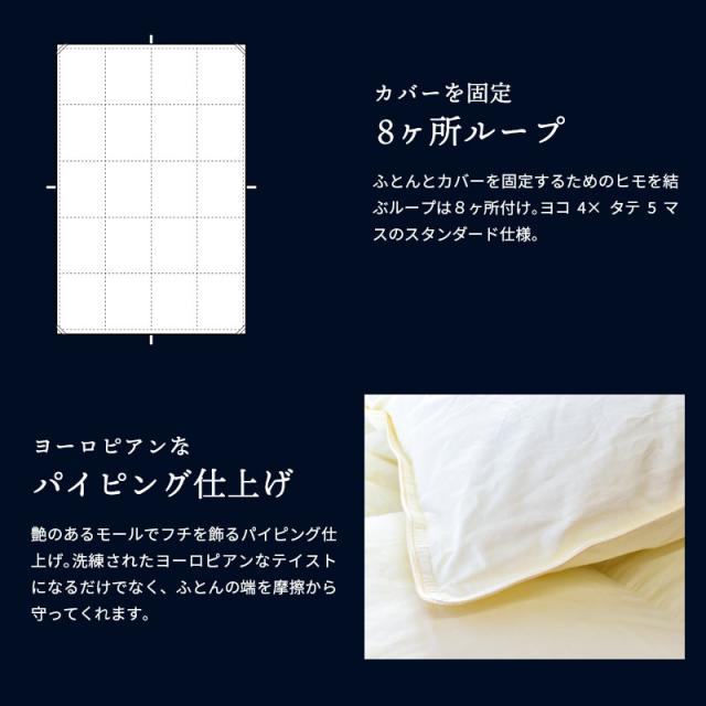 | 詰め物 | ハンガリー産ホワイトマザーグース ダウン95%、フェザー5%(合計充填量1.1kg) |