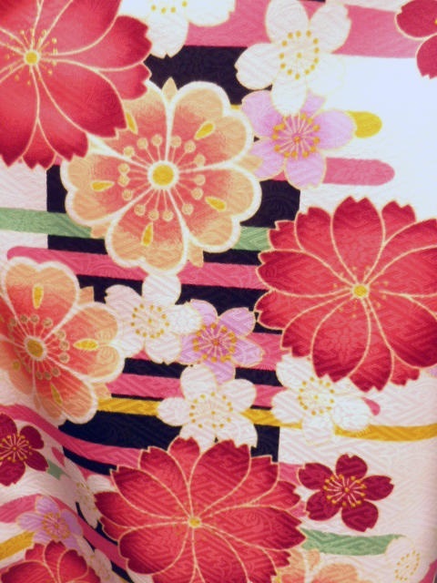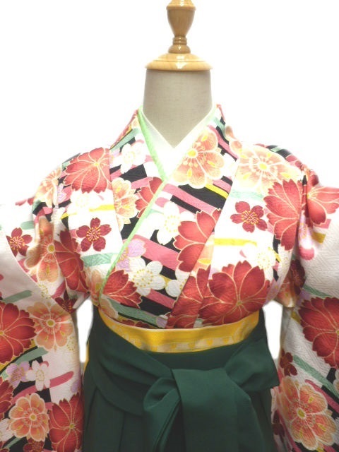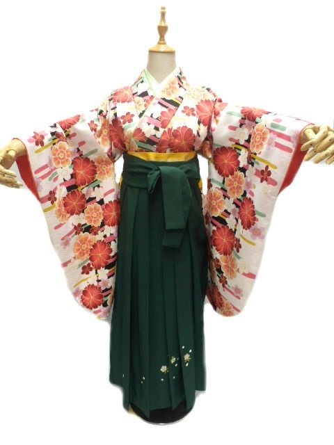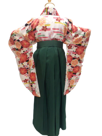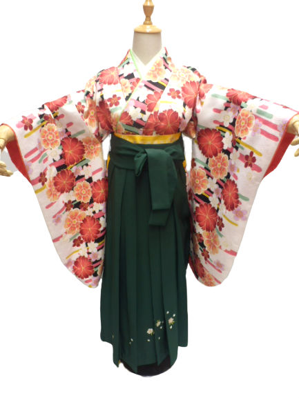 着物色:白地 八重桜柄 袴色:緑地 桜刺繍柄