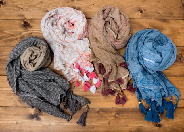 どのカラーも裾にタッセルが付いてヒラヒラと軽やかな印象です。