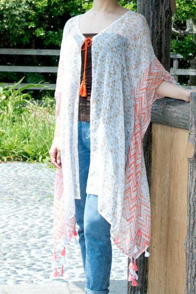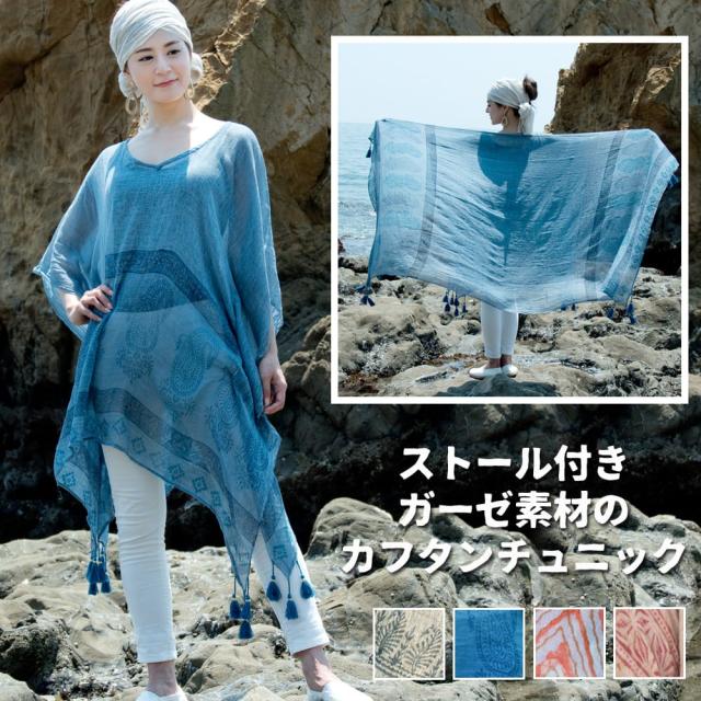 ストール付き ガーゼ素材のカフタンチュニック / コットン ウッドブロック TIRAKITA(ティラキタ) レディース エスニック アジアン 半袖 トップス エスニック衣料 アジアンファッション エスニックファッション