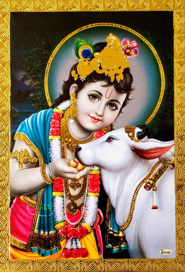 金の神様ポストカード 仔牛を愛でるベイビークリシュナ / ポスター ゴールド インド 本 印刷物 ステッカー