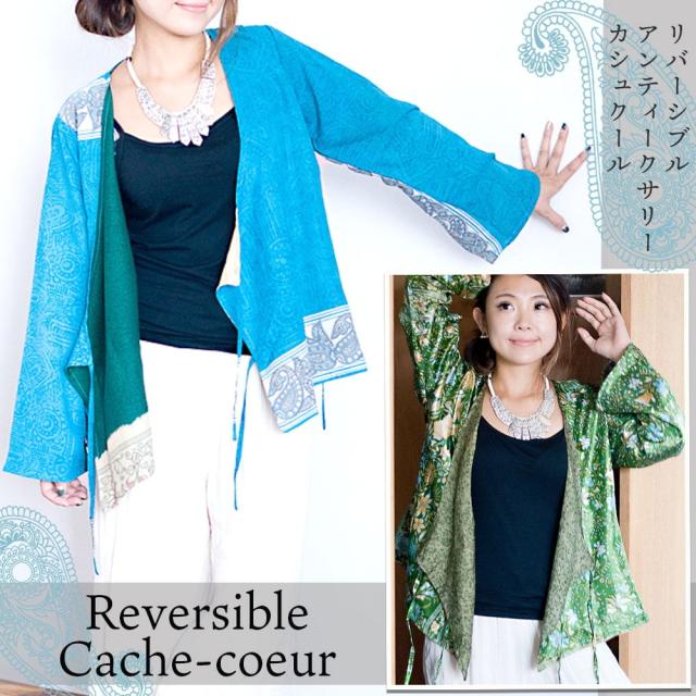 1枚で2度嬉しい!長袖リバーシブル・オールドサリー・カシュクール / カシュクール、オールドサリー、カーディガン、羽織もの、女性用 シャツ、サリー、リバーシブル、ショート丈、 TIRAKITA(ティラキタ) エスニック衣料 【エスニック・アジアン衣料