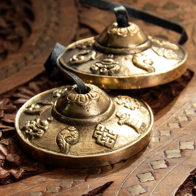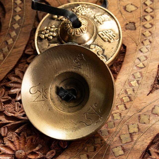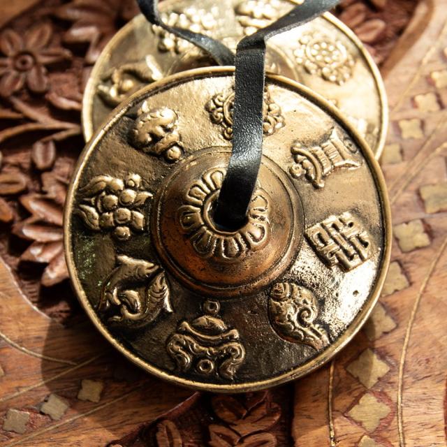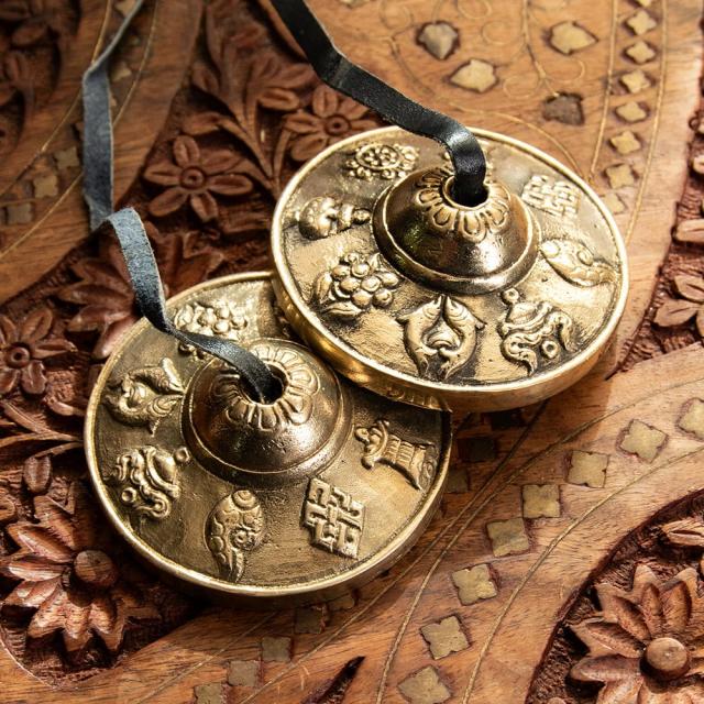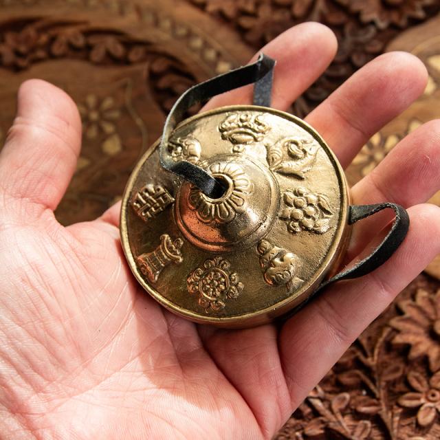 幸運の八吉祥柄ディンシャ【約6.5cm】 / ディンシャ、チベタンベル、マンジーラ、ネパール 楽器、ネパール 打楽器、打楽器、民族楽器、吉兆柄 民族楽器 【インドとアジアン民族楽器