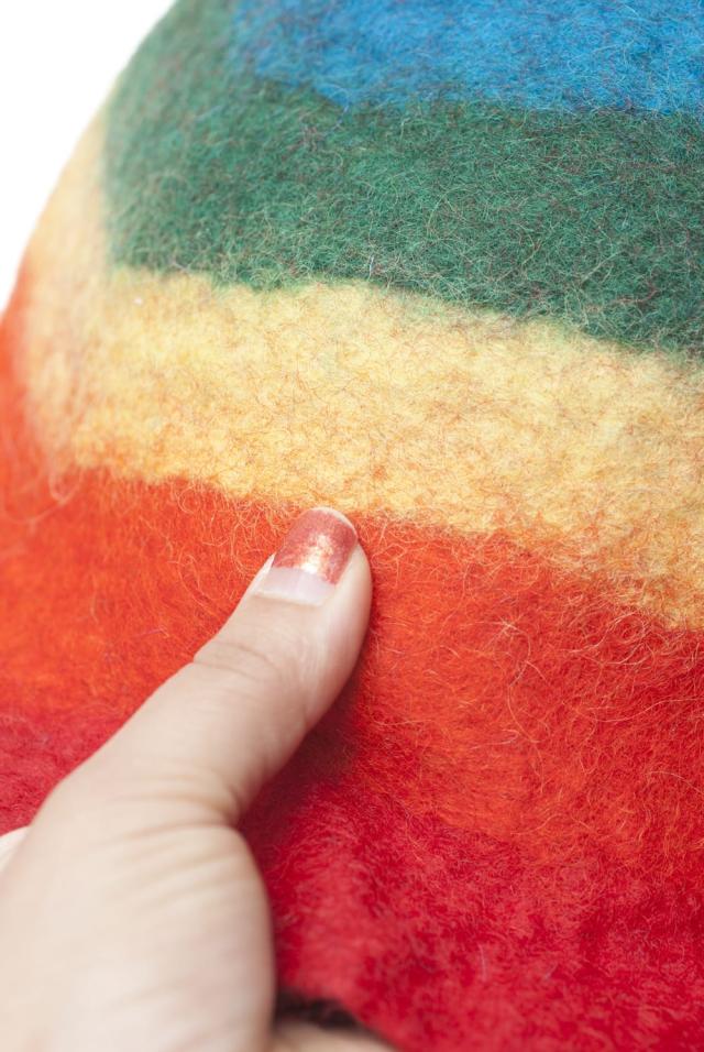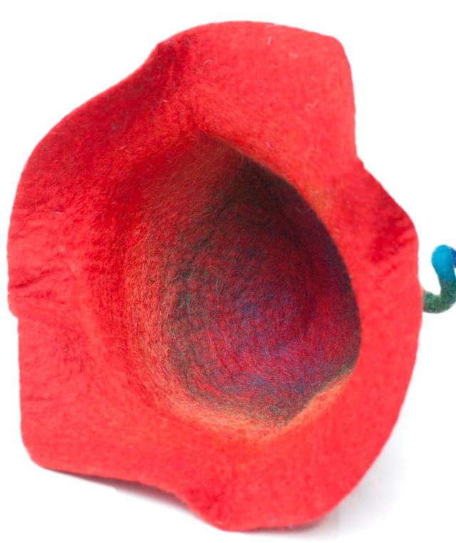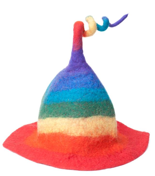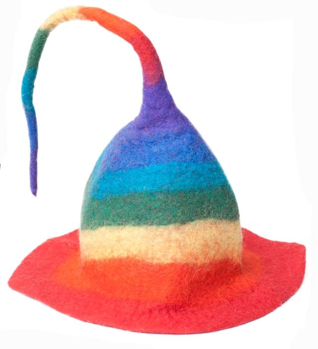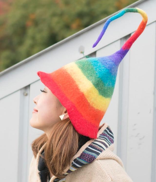 つばのないカラフルなフェルト製の帽子のてっぺんからひょろりととんがりが出ていて、しかもこのとんがりはハリガネが入っているので自在に形を作ることができます。ノリノリのときはピンと張ったり、イマイチな気分のときはくねくねにしたり、その時の気分次第でいろんな形を楽しめる帽子です。