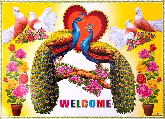 とても派手にWELCOMEと印刷された、約36cmx26cmのA3サイズ程度のポスターです。このポスター、日本人の感性ではまず浮かんでこないデザインばかりです。極彩色の色の組み合わせとそのグラデーション、コントラストが強いキャラクターや、平和や自由や愛のモチーフの鳥が並んでいたり、豪華に着飾った美しいインド人女性が並んでいたり、花が並んでいたりとても賑やかな気分になります。インドではお店の軒先に貼ったりするようです。あとシンメトリーなデザインが多いんです。