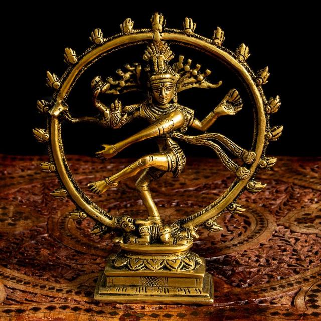 片足を大きく振り上げてガナ(小人・邪鬼)の上で踊るシヴァ神は、「舞踊王」を意味する「ナタラージャ」とも呼ばれ、非常に人気のある図像です。この図像は南インド発祥と言われており、南インドの古典舞踊にも同様のポーズや動きが盛んに使われています。火炎で縁取られた円形の光背いっぱいに広がる髪、しっかりとした体幹からしなやかに手足が伸ばされる表現からは、生命の律動がそのまま伝わってくるようです。素材は古来より仏像製作に使われてきたブラス製で、耐久性抜群。10年でも20年でもお使い頂け、年月と共に風合いがよくなります。見て、飾ってきっとご満足いただけると思います。