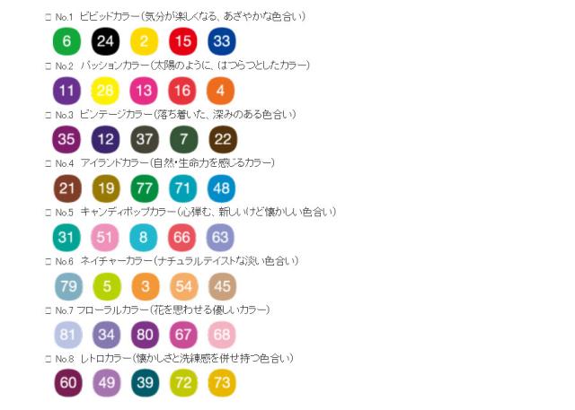 ■色数:5色 ライトブルー(8)、エメラルドグリーン(31)、ライトピンク(51)、ライトバイオレット(63)、コーラルピンク(66)