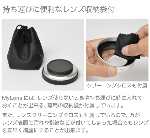 | レンズ本体、フロントキャップ、リアキャップ、収納ケース、レンズクリーニングクロス、取扱説明書(保証書付)、ステップアップリング2種類(52mm-46mm、52mm-49mm) |