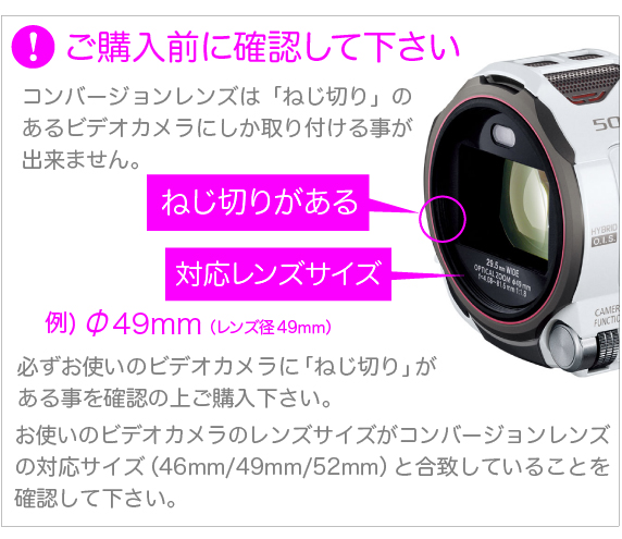 ※ビデオカメラの種類や倍率(最大広角にした時など)によっては、撮影時に画像にケラレ(画面の端にレンズの影が写る)が発生する場合があります。
