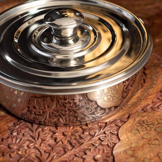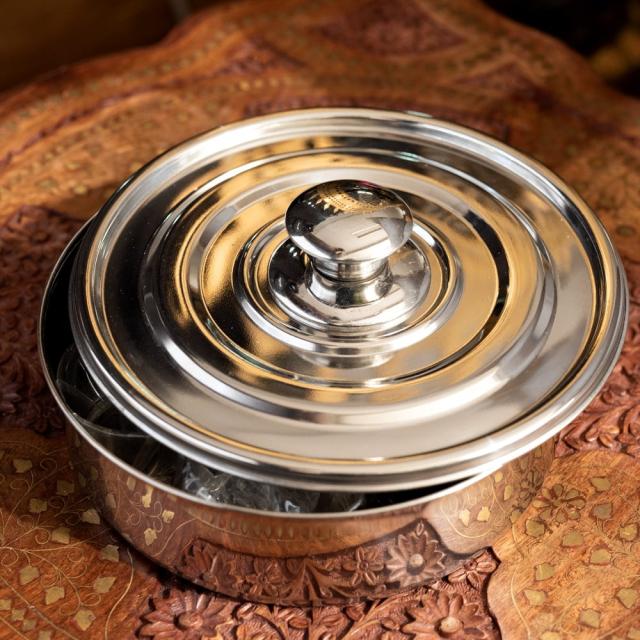取っ手つき円形スパイスボックス[21cm] / 保存、スパイスボックス、スパイス 入れ、スパイス、インドカレー、インド料理、南インド料理、ターメリック インド アジアの食材 【インドとアジアン食品・食材