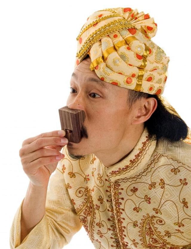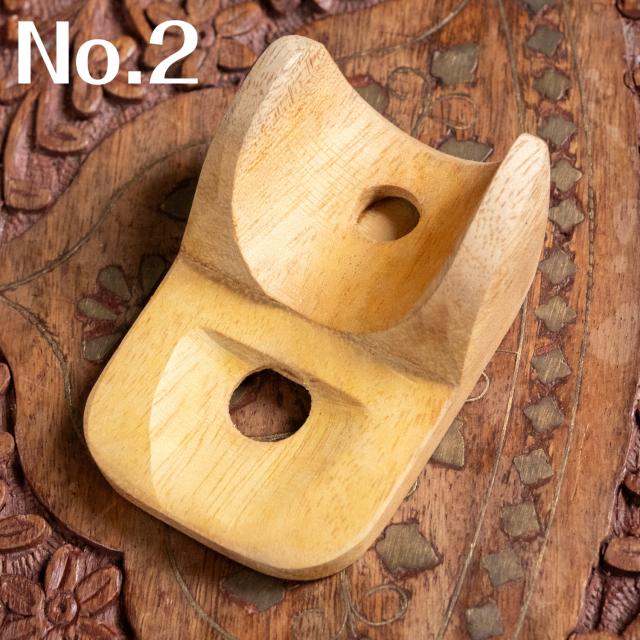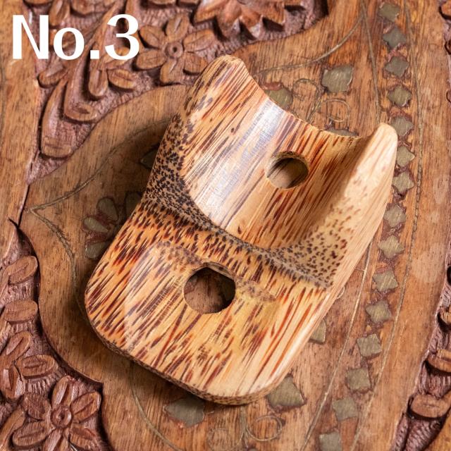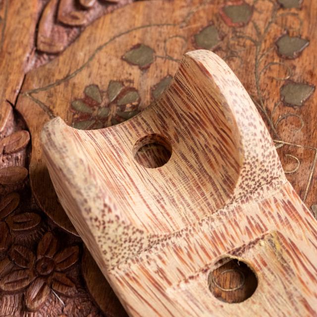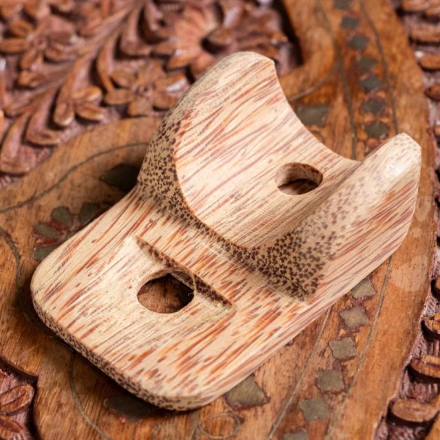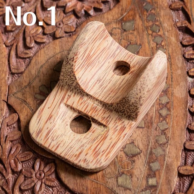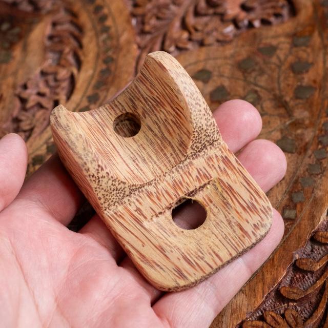 見た目は変な形をした木のプレートです。一見しただけではどう使うか全くわからないのですが…穴の開いている部分を鼻に、薄めの部分を口にセットし、鼻から息を吹き出すと…あら不思議!! メロディが奏でられてしまいます!!