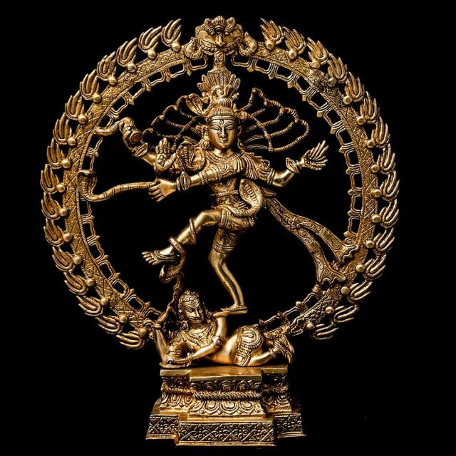 片足を大きく振り上げてガナ(小人・邪鬼)の上で踊るシヴァ神は、「舞踊王」を意味する「ナタラージャ」とも呼ばれ、非常に人気のある図像です。この図像は南インド発祥と言われており、南インドの古典舞踊にも同様のポーズや動きが盛んに使われています。火炎で縁取られた円形の光背いっぱいに広がる髪、しっかりとした体幹からしなやかに手足が伸ばされる表現からは、生命の律動がそのまま伝わってくるようです。素材は古来より仏像製作に使われてきたブラス製で、耐久性抜群。10年でも20年でもお使い頂け、年月と共に風合いがよくなります。見て、飾ってきっとご満足いただけると思います。
