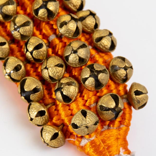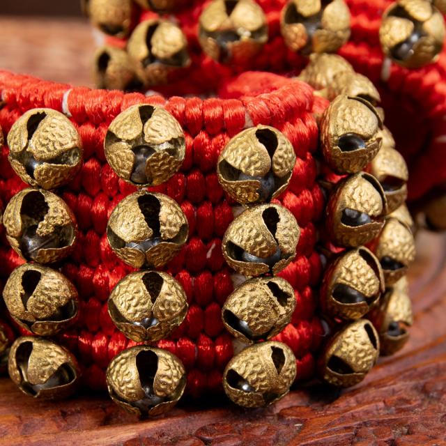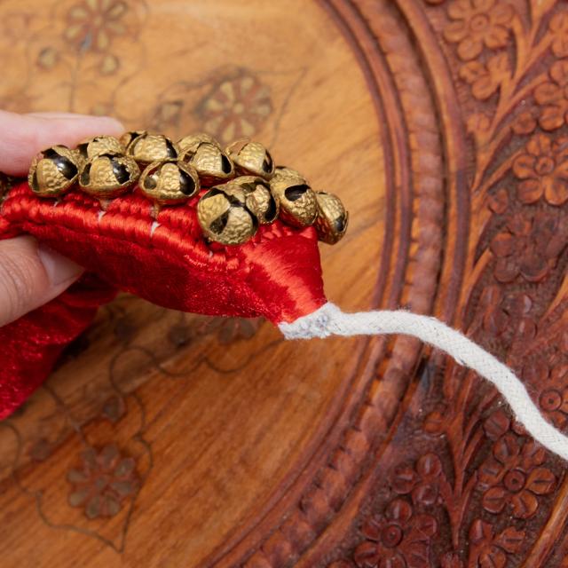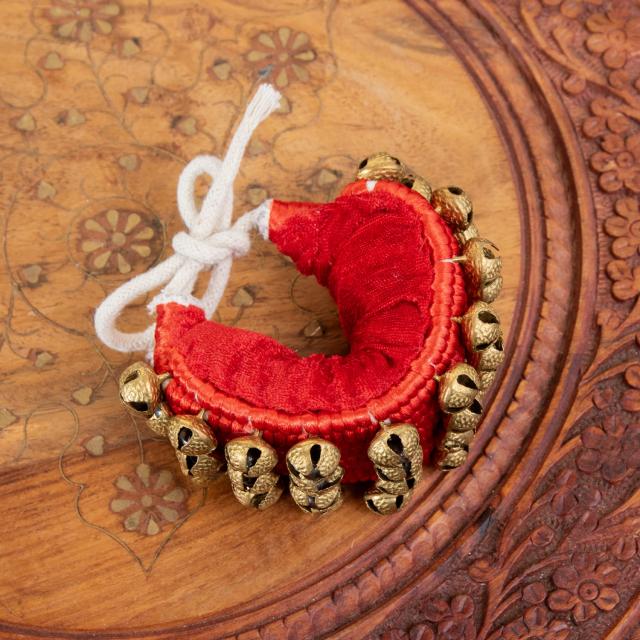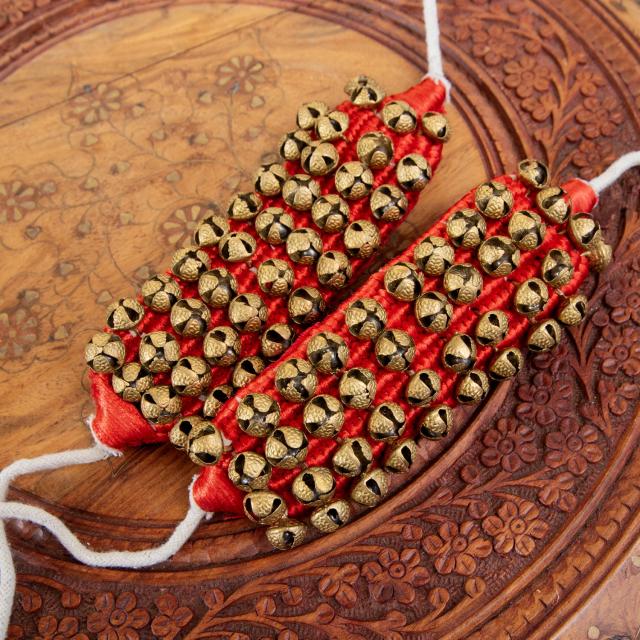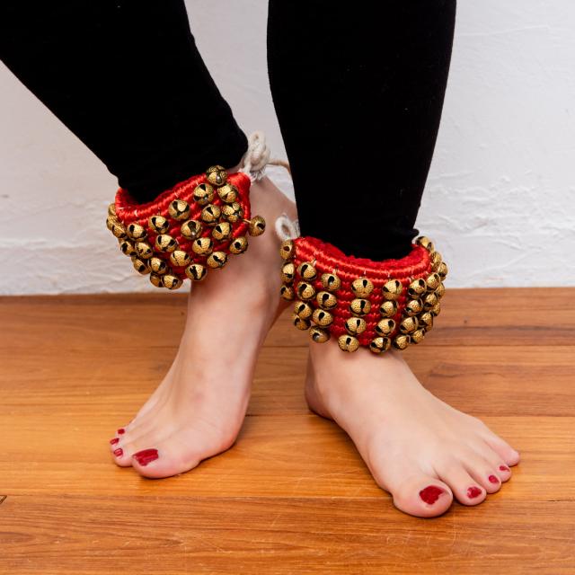 こちらはインド舞踊などで使われる、足につける鈴です。舞踊やダンスなどの時に、ささっと巻いて踊ると、足元からシャンシャンと涼やかな音があなたのリズムと一緒にやってきます。ダンスや舞踊だけでなく、劇やステージなど、踊りに音を合わせたい時に便利な紐タイプの鈴です。