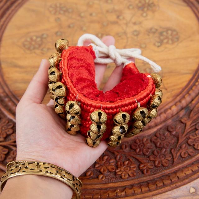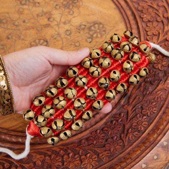 こちらは、たっぷり4列の鈴が配された太めのタイプ。鈴の数が多いので音もより分厚く、豊かに鳴り響きます。長時間踊っても足に傷がつかないよう、パッド付きになっていて、裏面はベルベットで覆われております。結ぶための紐は滑りにくいコットン製で、簡単には取れないように本体と一緒に編み込まれています。