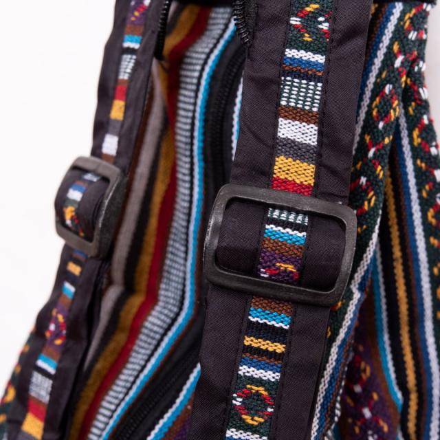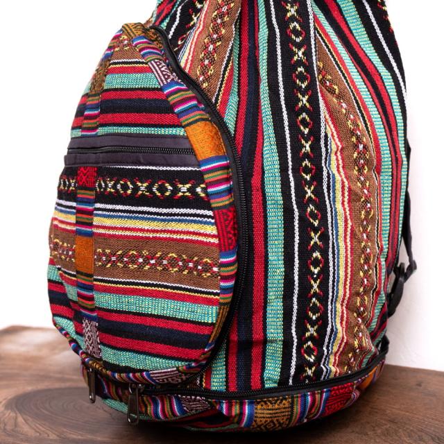 このバッグの布地はゲリと呼ばれる、ネパール独自の生地が使われています。カラフルなこの生地は、ネパールの人たちが自分たちが好きな色合いで作っているもので、太めの糸で織られた温かみのある風合いです。ちょっと粗めの生地ですのでワイルドな雰囲気にもピッタリです。