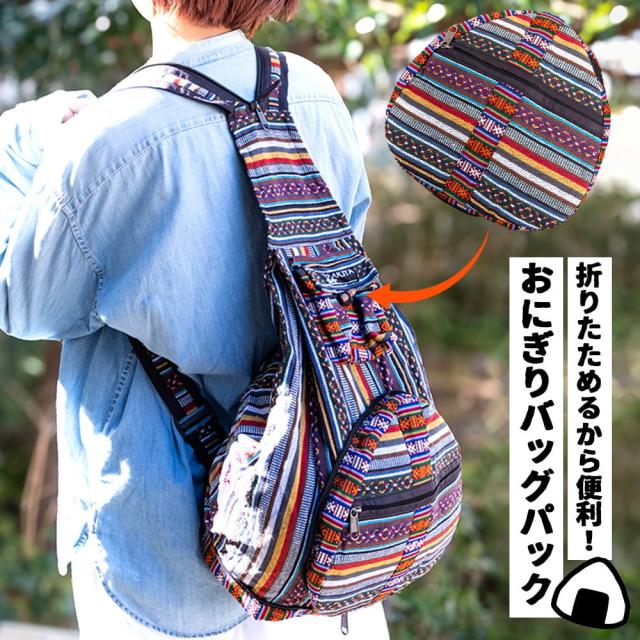 【全5色】折りたためるから便利!おにぎりバックパック / 折りたたみ バッグ リュックサック コットン インド かばん ポーチ エスニック アジア