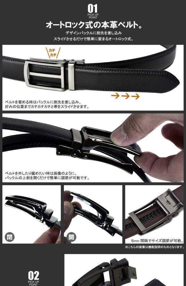 ●表に牛革、裏に合皮を使用した、オートロック式フリーサイズ本革ベルトです。