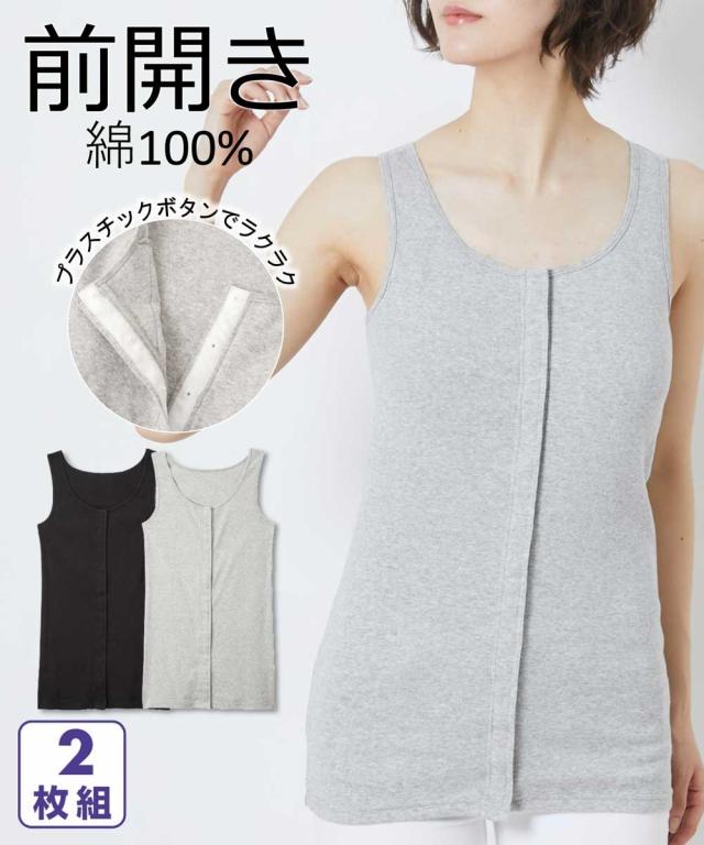 タンクトップ 前開き 2枚組 大きいサイズ レディース 綿100% 丈長め 黒/杢グレー 4L/5L/6L インナー 肌着 入院 手術 診察 授乳 ハハプレ ニッセン nissen