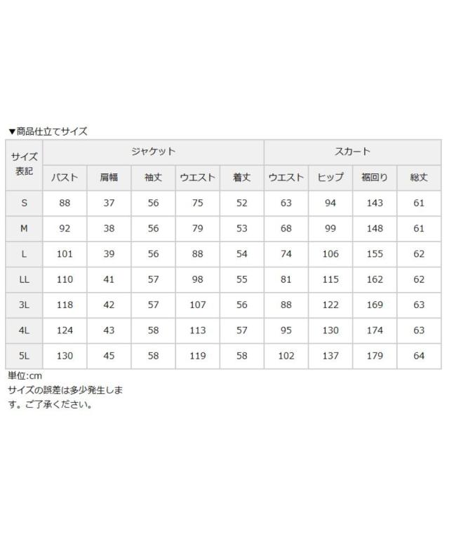 品質=表地:ポリエステル95%・ポリウレタン3%・レーヨン2% 裏地:ポリエステル100%(ジャケット:前身頃のみ・スカート:総裏)ジャケット:前ホック開 肩パット有 左内ポケット1 スカート 両脇ゴム入 後ファスナー開 この商品は上下同サイズのみで販売します。※注意コメントお客様のパソコン・スマートフォンのモニターや照明等により、実際の色と多少異なるように感じられる場合がございます。ご了承ください。 ウエストサイズはゴムを縮めた状態での表示となります。 原産国:中国製 洗濯表示:洗濯機OK(ネット使用)