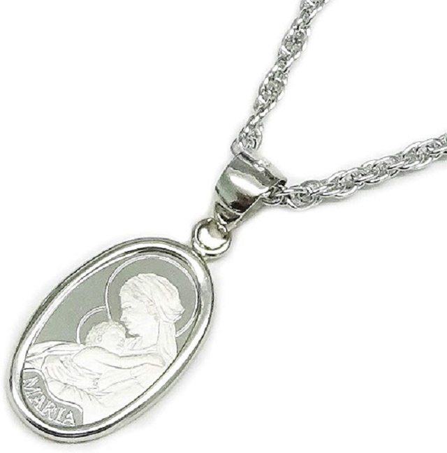 表面は聖母マリアがキリストを慈しむ様に抱いているデザインで、裏面にはスイス・パンプ社のマーク、重量、品位が入っています。