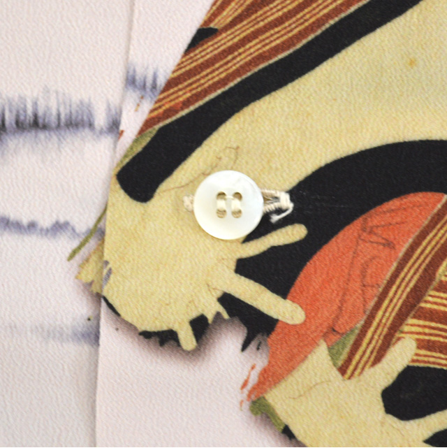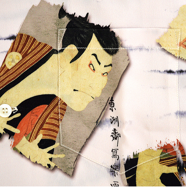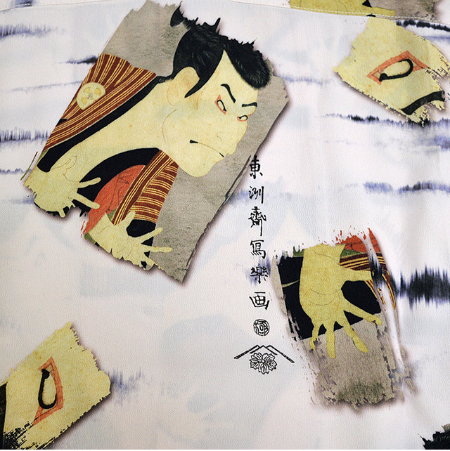 アロハシャツの黄金時代とされる1930〜50年代にかけて作られた「ヴィンテージ」と呼ばれる貴重なアロハシャツを再現し、現代に蘇らせているブランド「SUN SURF」から、半袖アロハシャツ 日本の意匠by SUN SURF東洲斎写楽「三代目大谷鬼次の奴江戸兵衛」(SS38472)のご紹介です。 「恋女房染分手綱」の劇中で江戸兵衛役を演じる三代目大谷鬼次を描いたこの作品は、全てが謎に包まれた浮世絵師、東洲斎写楽の手によるもの。 歌舞伎役者の上半身を大胆な構図で描いた大首絵(おおくびえ)の作品が有名で、鷲鼻や受け口など、その役者が持つ顔の特徴を誇張して巧みに描いており、迫真の表情や躍動感あふれるポーズの描写も特徴です。 サンサーフでは版画ならではの世界観を追求し、紙の質感をシャツの地に表現。 アロハシャツは、生産も非常に少なく、レアなアイテムとなっています。 | ||||||||||||||||||||||||||||||