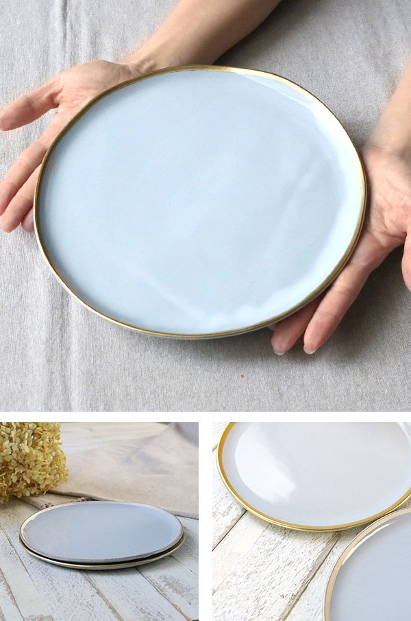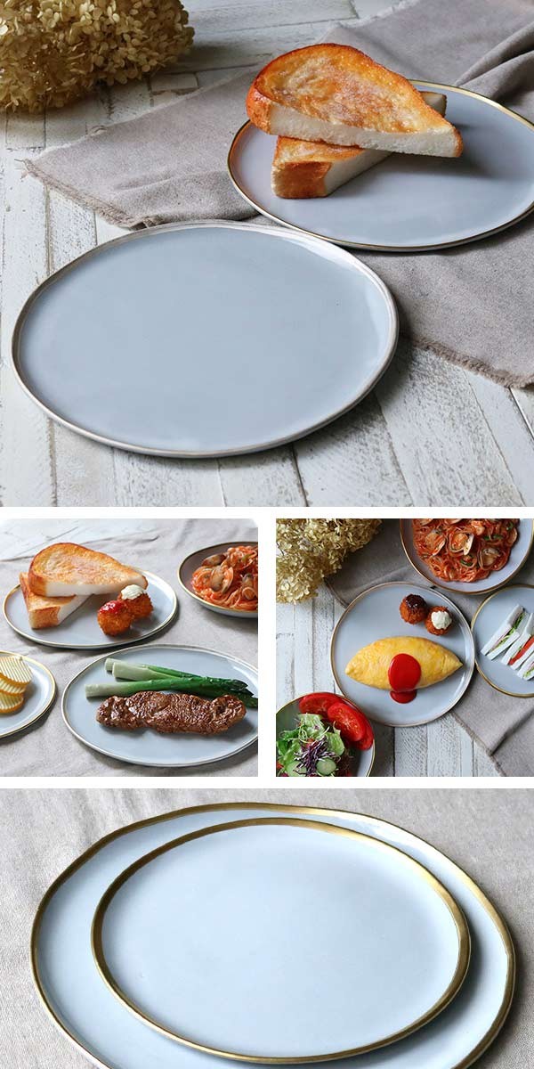 優しいペールグレーに、アクセントとなる縁取りが美しいプレートです。メイン料理や、副菜を盛り付けたワンプレートランチにも最適です。均一ではないリム(ふち)と上品な色味がお料理や野菜の色をより一層引き立てます。