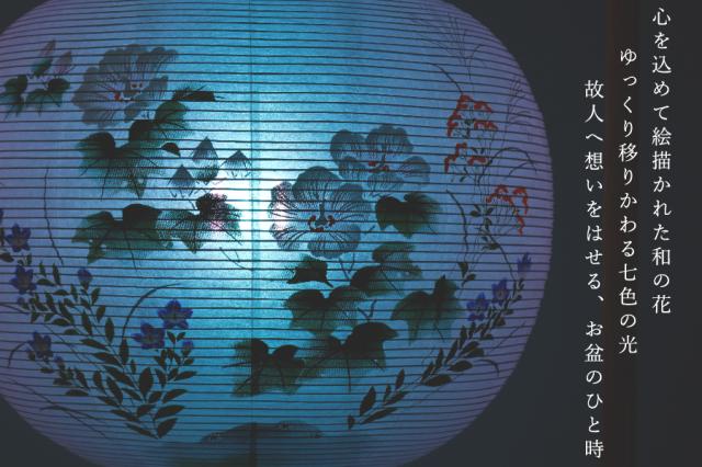 灯もせば七色に移ろうLEDの光源と、いにしえからの伝統的なお盆提灯のシルエット。ゆっくりと彩りを変え、ゆったりと流れる夏のひと時を演出してくれます。心安らぐ和モダンテイストあふれた逸品です。