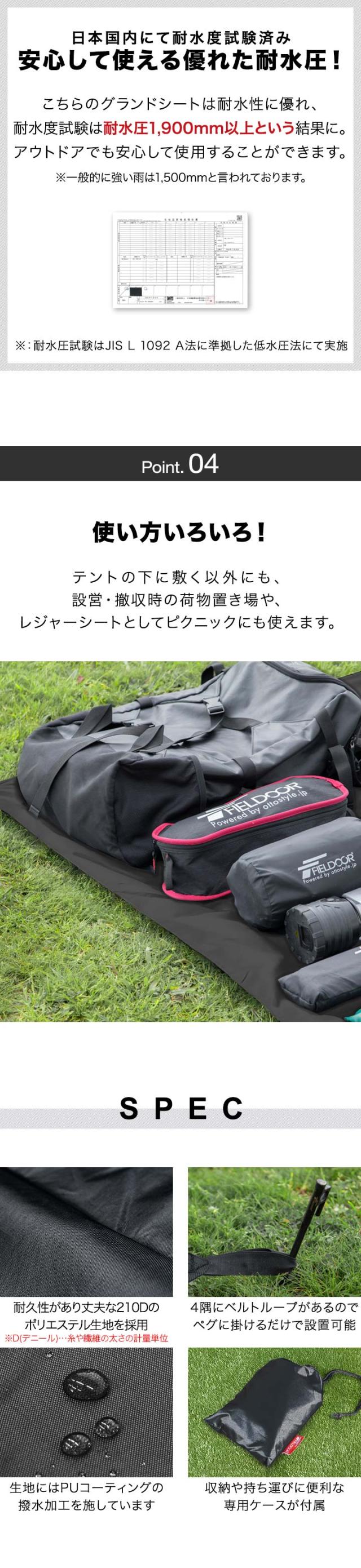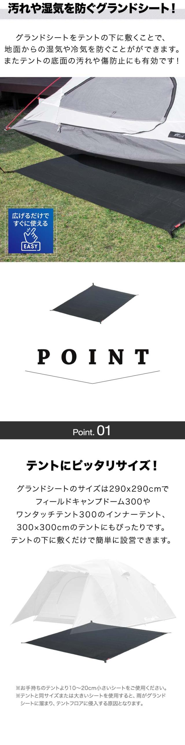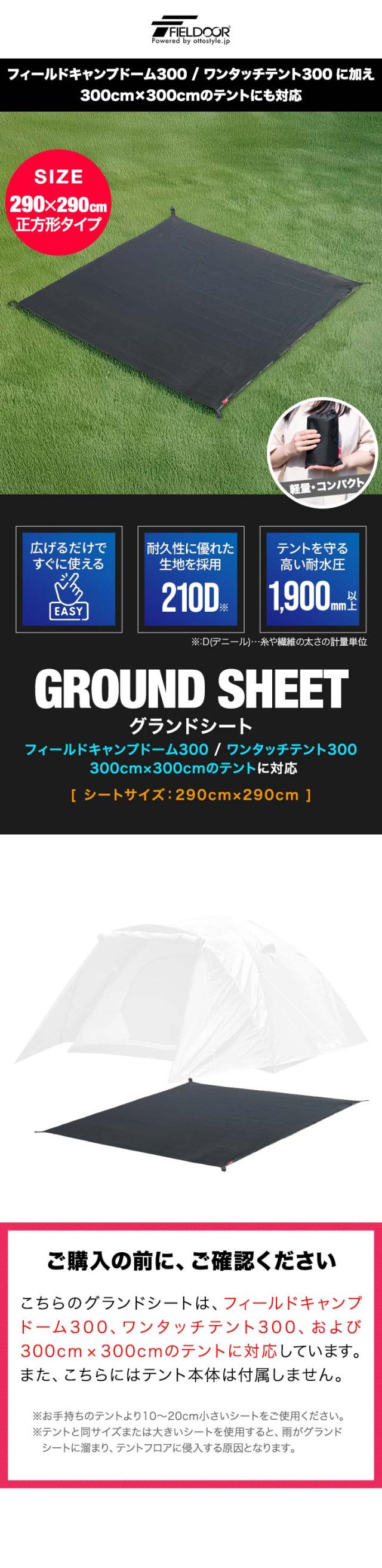 グランドシート テントシート 290cm × 290cm 撥水加工 湿気防止 汚れ防止 キズ防止 テント用 レジャーシート テントマット おすすめ 軽量 コンパクト サイズ 290 正方形 必要 アウトドアギア テントアクセサリー GROUND SHEET FIELDOOR 送料無料
