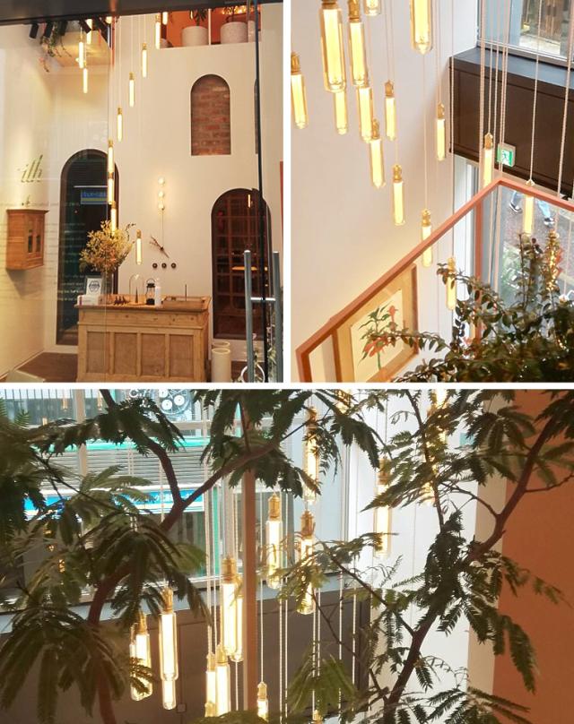 吹き抜け空間に複数灯ランダムなコード長さで電球を取り付ければ