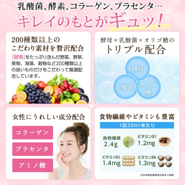 原材料名:イソマルトオリゴ糖液糖、食物繊維、発酵紅茶エキス末(紅茶キノコ)、植物発酵エキス、フィッシュコラーゲンペプチド、パイナップル果実抽出物(セラミド含有)、ハーブミックスエキス(デキストリン、シナモン、リコライス、アカメガシワ、フェンネル、クローブ、ジンジャー、金時ショウガ)、マンゴスチン抽出エキス、リンゴ抽出物、バラエキス、桜の花エキス加工粉末、レスベラトロール含有ブドウ若芽エキス、混合ハーブエキス(マルトデキストリン、ドクダミ、セイヨウサンザシ、カモミール、ブドウ葉)、乳酸菌末(殺菌)、豚プラセンタエキス、ベリー混合エキス(野生種ブルーベリー、ストロベリー、クランベリー、野生種ビルベリー、エルダーベリー、ラズベリー)、パン酵母エキス、トルラ酵母エキス/酸味料、香料、安定剤(ペクチン)、カラメル色素、甘味料(アセスルファムK、スクラロース、ステビア)、保存料(安息香酸Na)、L-ロイシン、L-バリン、L-イソロイシン、ビタミンB2、ビタミンB6、ビタミンB1、(一部に大豆・オレンジ・キウイフルーツ・バナナ・もも・やまいも・りんご・カシューナッツ・ごま・ゼラチン・豚肉を含む)